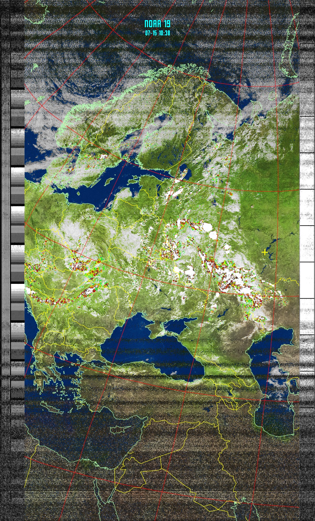 NOAA-19 (MSA with precipitation) Мультиспектральный анализ с областями метеоактивности.