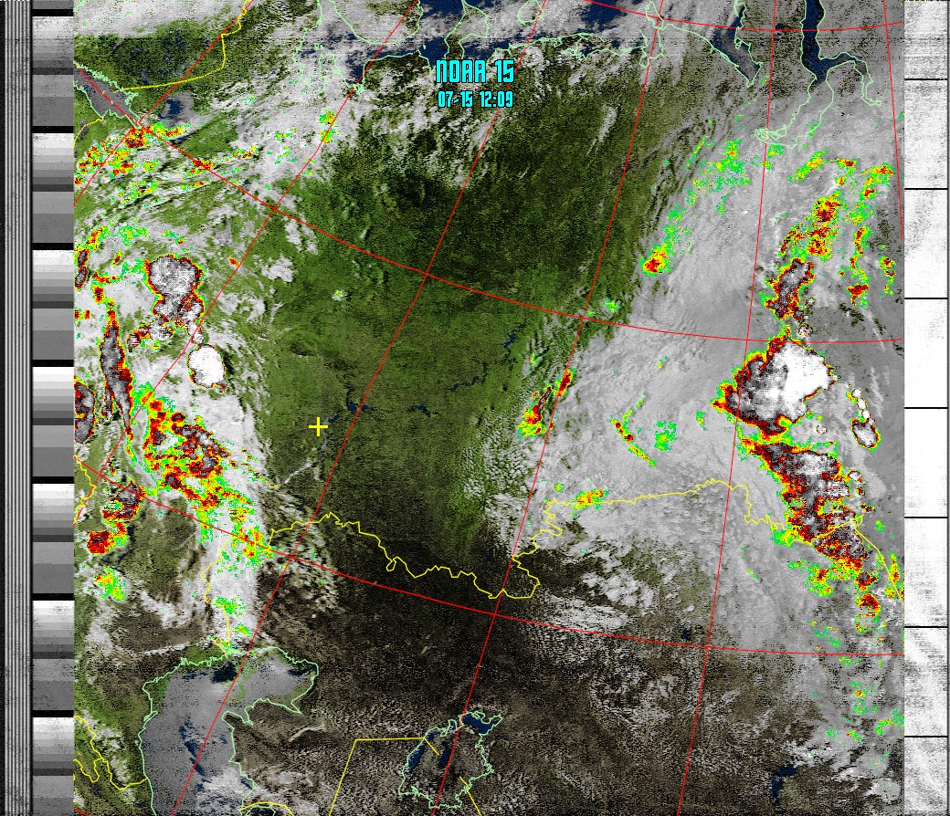 NOAA-15 (MSA with precipitation) Мультиспектральный анализ облачности с областями метеоактивности.