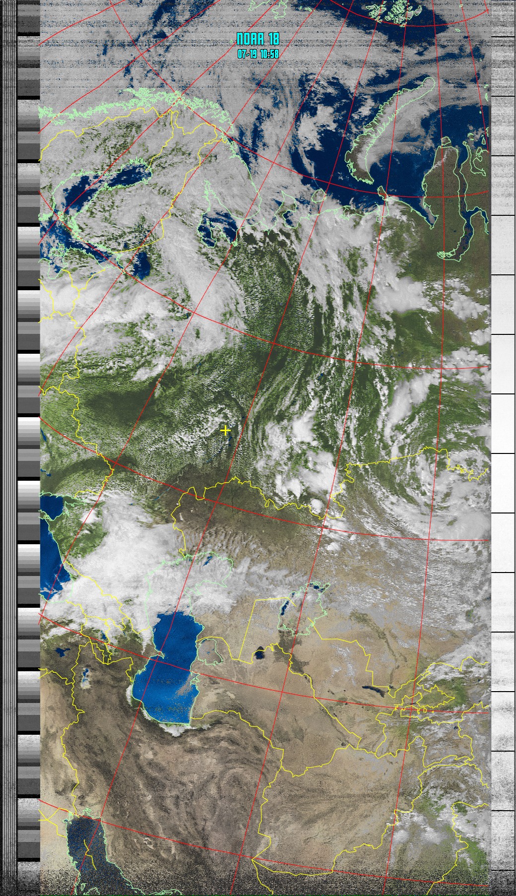 Данный снимок со спутника NOAA-18 впервые принял Юрий Штырлов, ученик 11 класса СОШ № 48 г. Ульяновска 19 июля в 14 час. 58 мин. Кроме этого изображения в видимом диапазоне для этого момента времени выявлены всего 9 изображений в черно-белом и цветном вариантах с поясняющей шкалой, например: