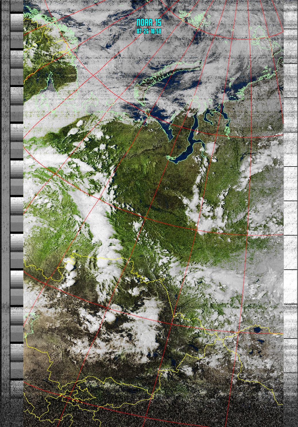 Спасибо за выставленные впервые снимки. Фотографии получились хорошие, несмотря на то, что спутник пролетал достаточно далеко от Ульяновска. Антенна приняла изображения вне собственного места расположения, даже "крестик" не проявился.