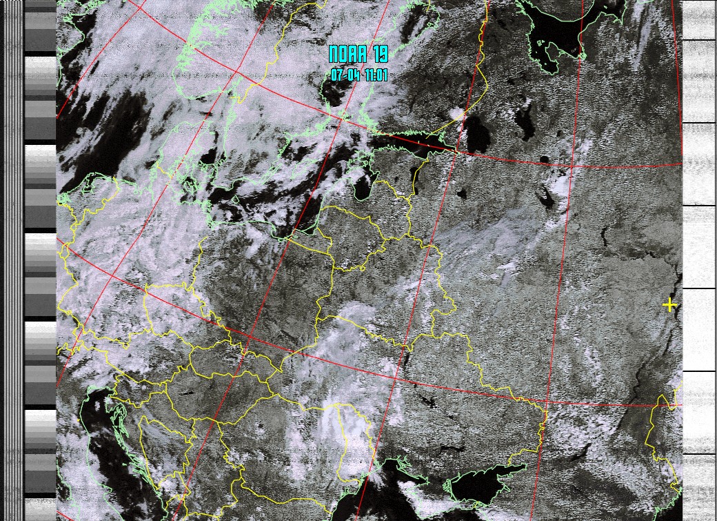 NOAA-19 Композитное изображение. (Class enhancement. Контрастная облачность) (Обрезаны области с шумом)