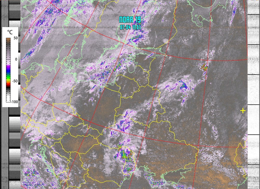 NOAA-19 Композитное изображение. (NO-IR Температура облачности) (Обрезаны области с шумом)