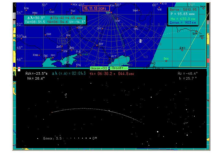 Здесь показана "Ближняя зона" из Карты мира и трасса пролёта МКС на звёздном небе Ульяновска 15 ноября около 6ч.30м. мск (страничка из моей программы слежения за МКС). (Ещё раз извиняюсь за нерезкость - пока не научился выкладывать качественное изображение на наш сайт.) На карте правая граница синей зоны - начало светлых сумерек перед рассветом, когда блекнут слабые звёзды (но МКС ещё видна уверенно), правее - жёлтая линия у Целинограда (Цлн) - восход Солнца. А слева линия из широких чёрных штрихов от Азова через "Хрк-Тул-Мск" - граница тени на высоте орбиты, левее которой МСК не видна. Как видим, эта часть орбиты (дуга из белых точек со значком МКС) освещена полностью. Как и на карте Мира, станция летит навстречу Солнцу - слева направо.